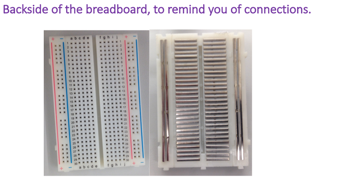 Please note: At times exact positions are used, however, below we describe how a breadboard is connected so you should be able to construct using any connected rows and columns that you like.