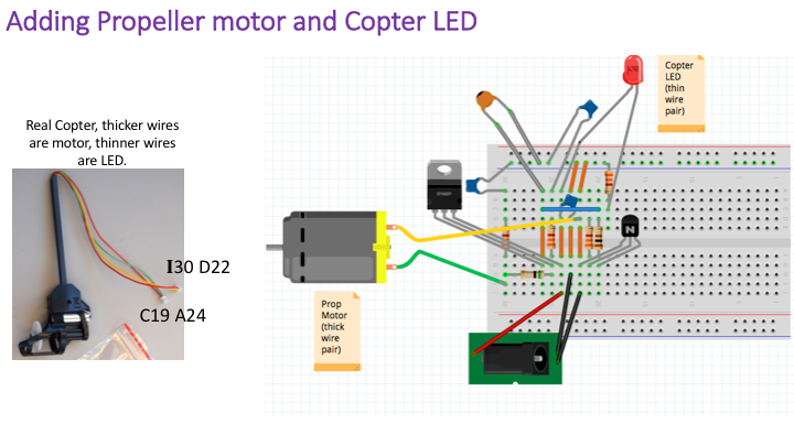 The copter assembly shown below has a power-indicator LED, a power-hungry motor, and a plastic propeller. There are two two-pin connectors terminating two pairs of wires on the copter assembly, the thicker pair of wires is attached to the motor and the thinner pair is attached to the LED. one connected to a pair of very thin wires, and one connected to a pair of thicker wires.